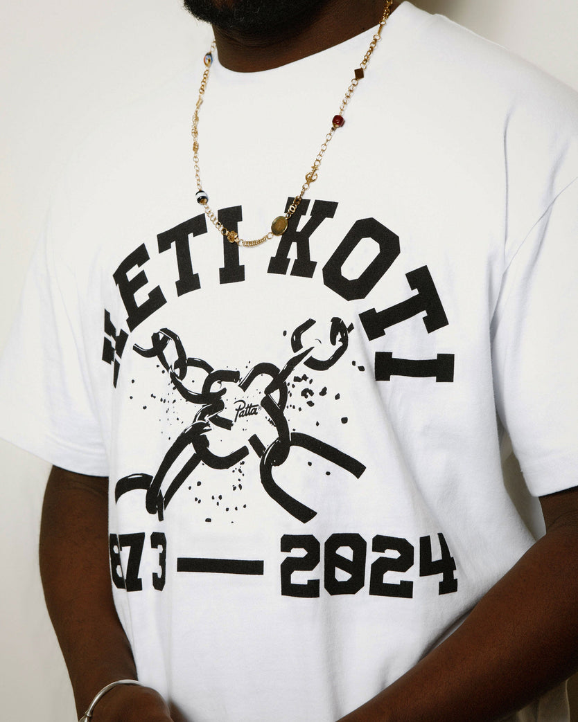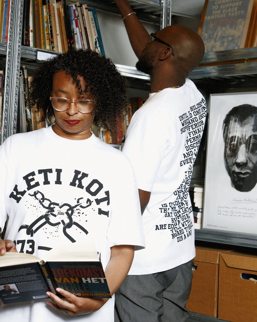 In commemorating of the 151st anniversary of the emancipation of enslaved people in Suriname in 1873, Patta is proud to launch the Keti Koti Graphic T-Shirt. "Keti Koti," which means "the breaking of chains" in Sranan Tongo, holds profound significance for humanity. This day serves as a time to reflect on our history, honour the resilience of those who endured the horrors of slavery, and pay tribute to their indomitable spirit.