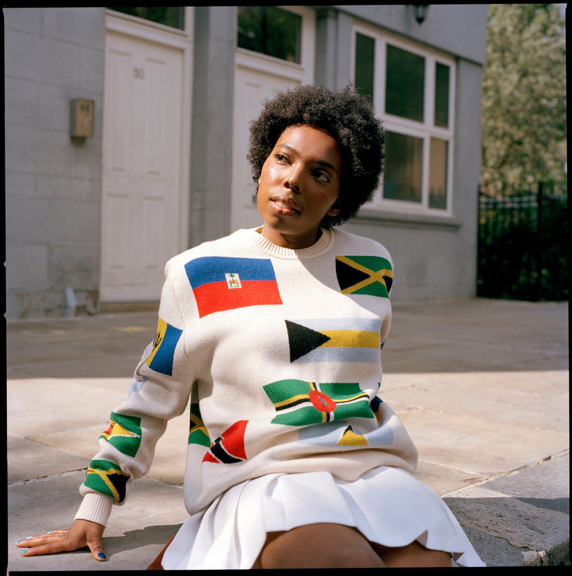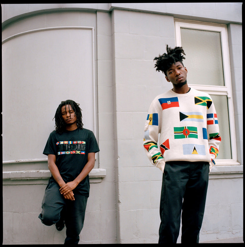 The collaboration between Patta & Small Axe features a Pearled Ivory Knitted Sweater bearing the flags of the countries in the West Indies as well as a pair of Graphic T-Shirts that collage graphics from both sides of the drawing board.